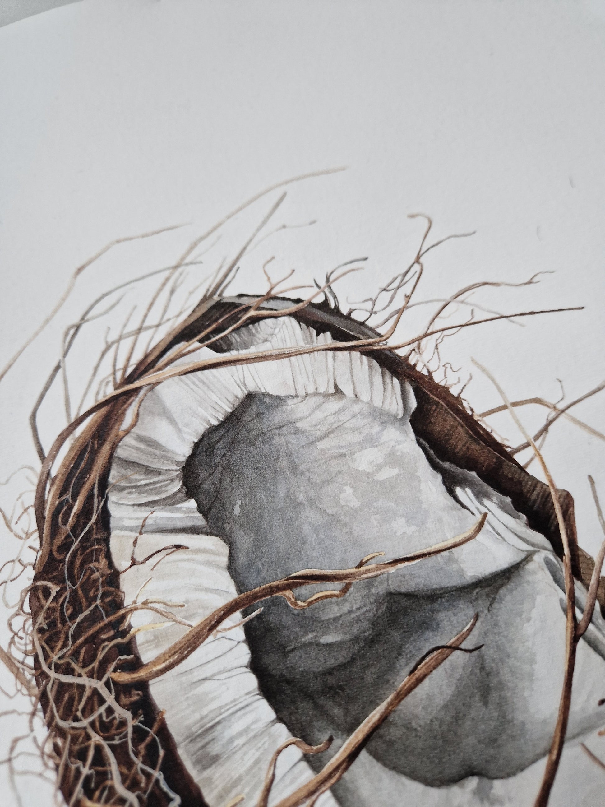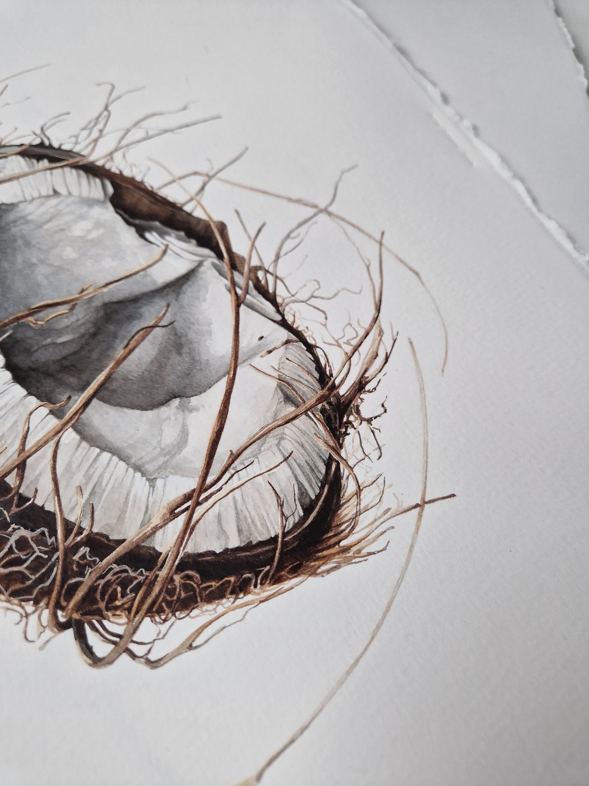 Broken coconut, Cocos nucifera, original watercolour botanical illustration