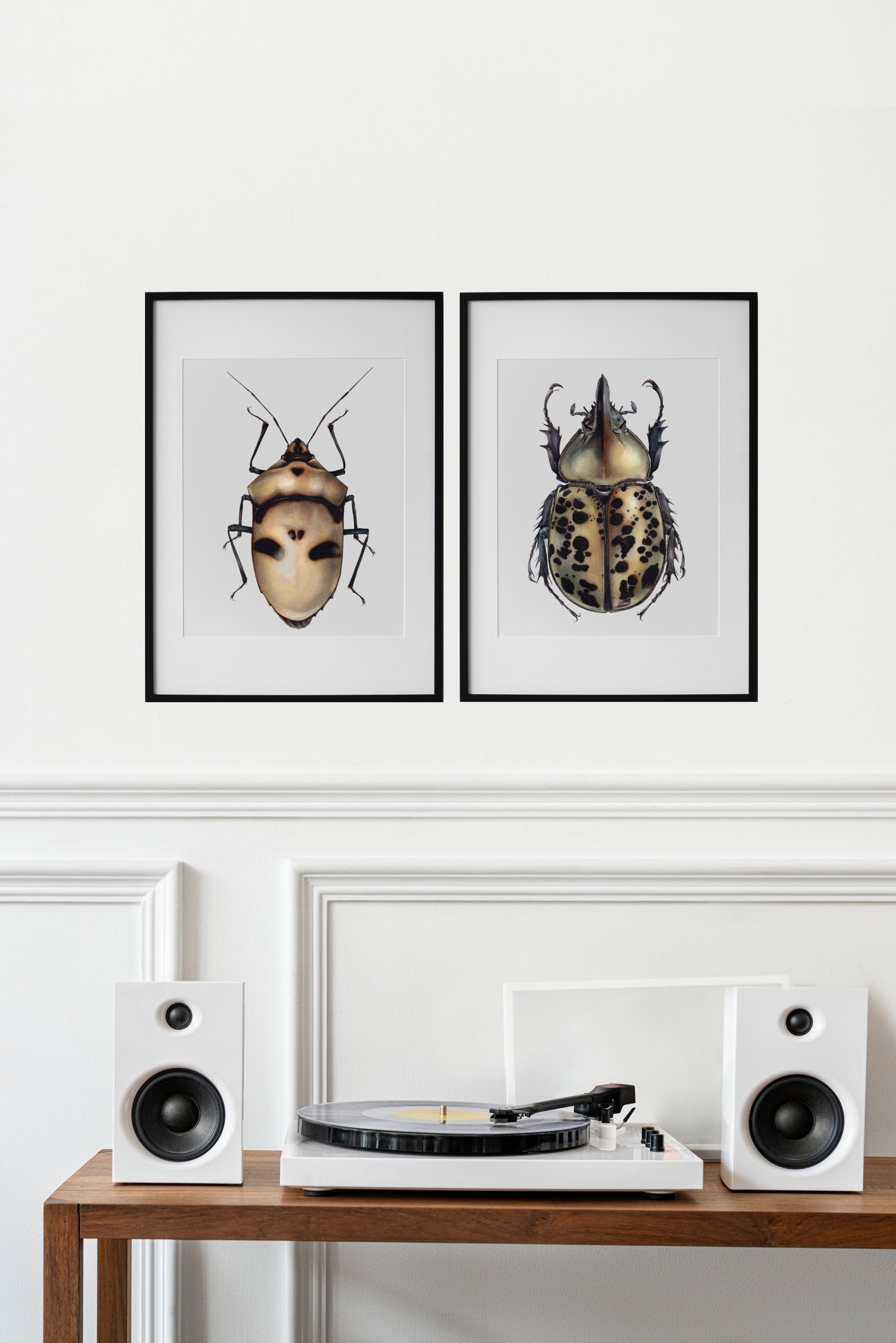 This original entomological artwork presents Dynastes tityus also know as eastern Hercules beetle, is a species of rhinoceros beetle native to the Eastern United States.
