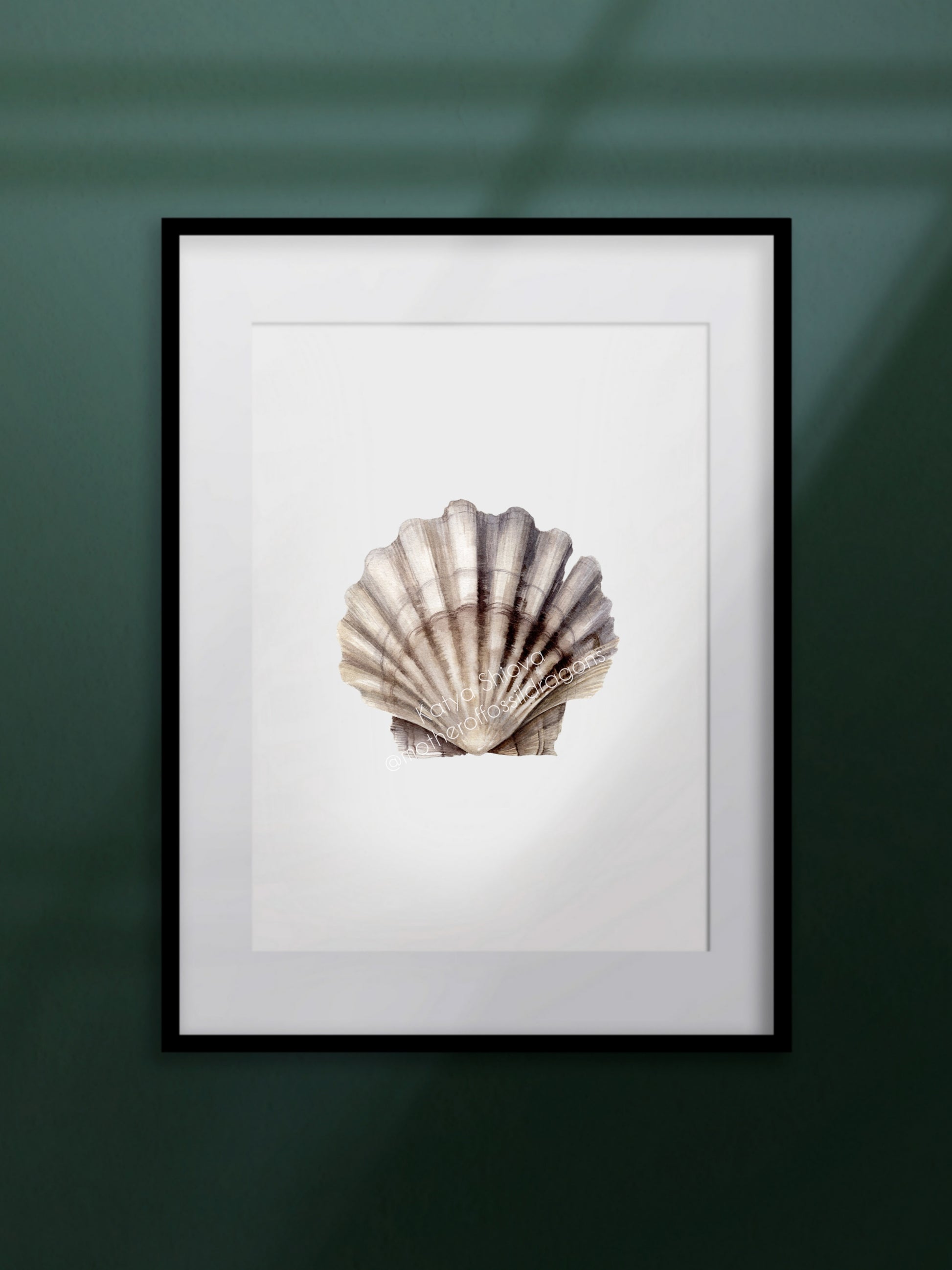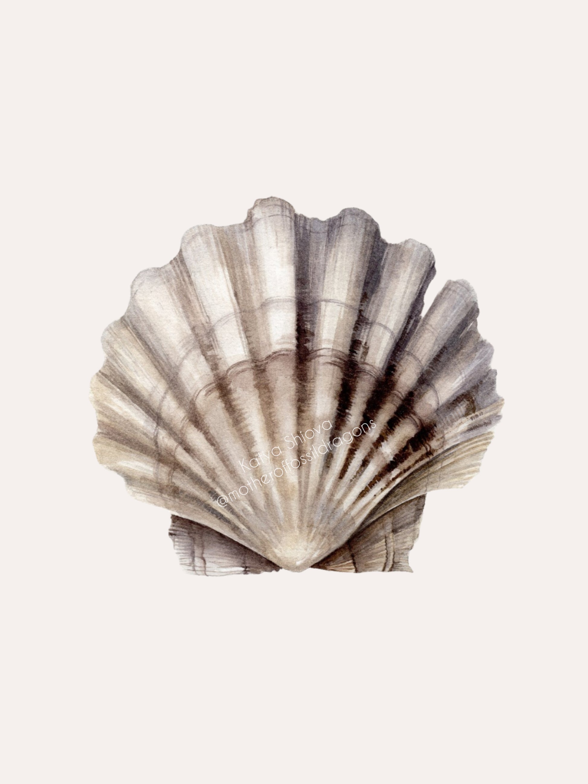 Scallop shell, fossilized Chesapecten jeffersonius from Virginia, original watercolour art
